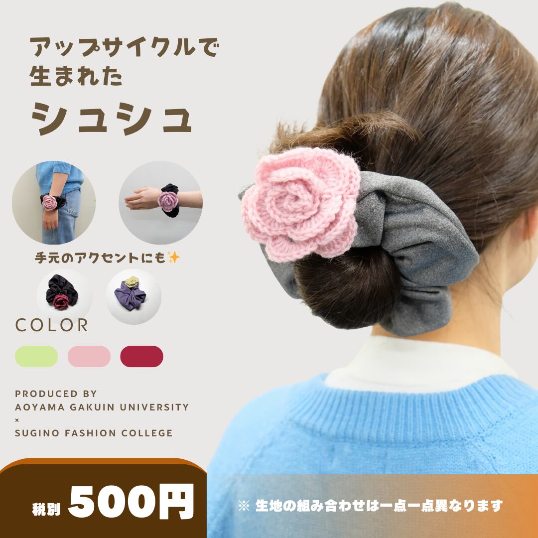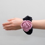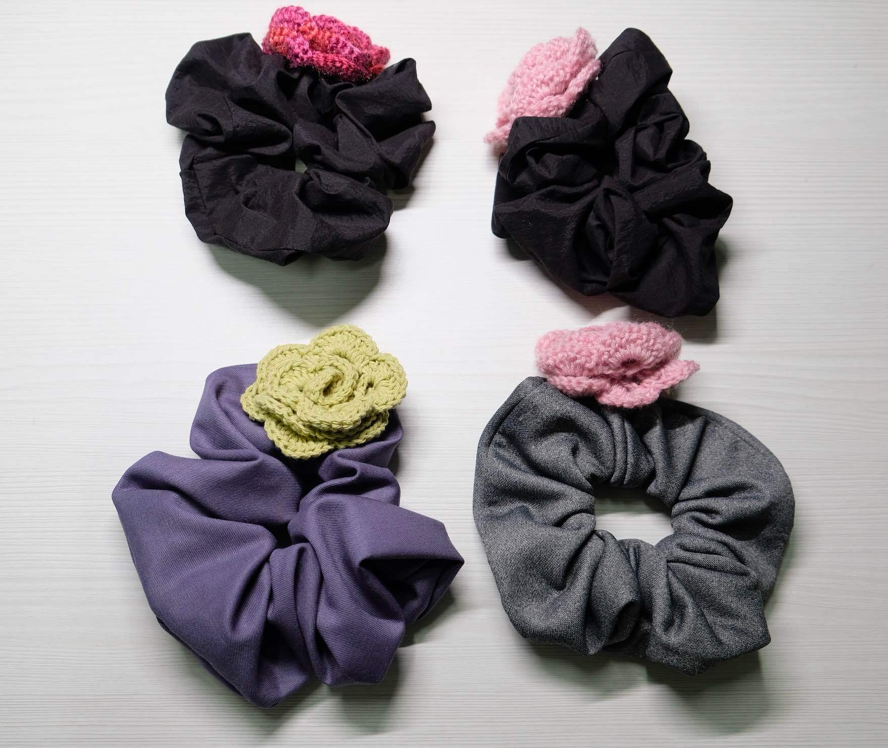 展示会のサンプル布と、手編みのお花モチーフを組み合わせて生まれた、ブラック × 手編みローズのスペシャルシュシュ